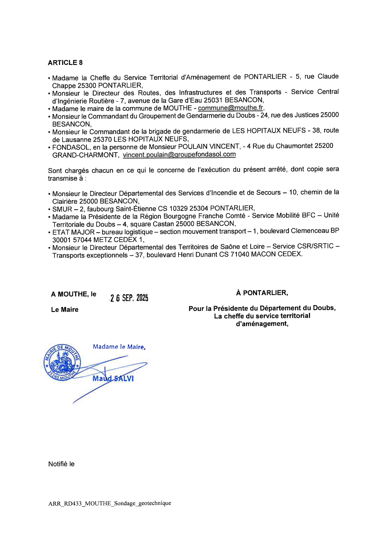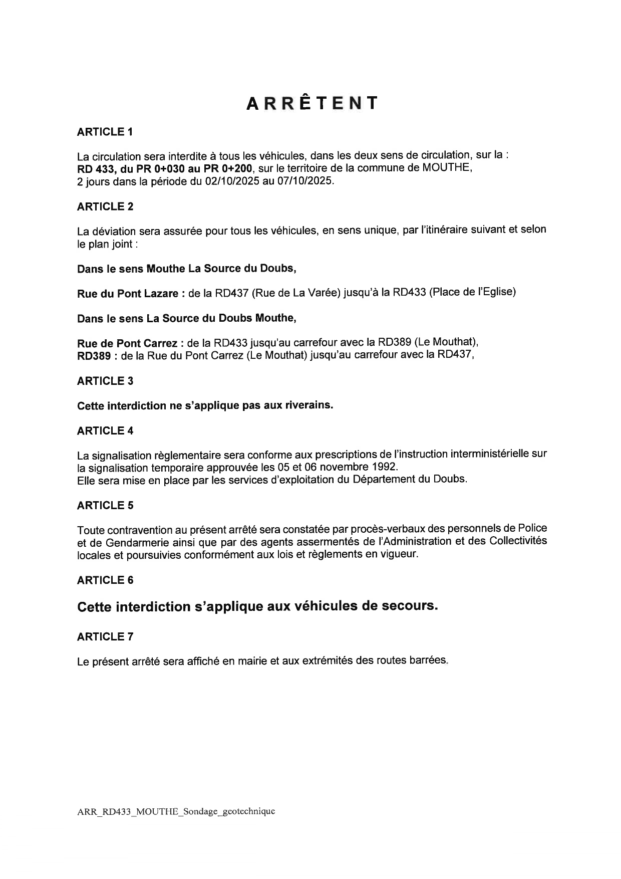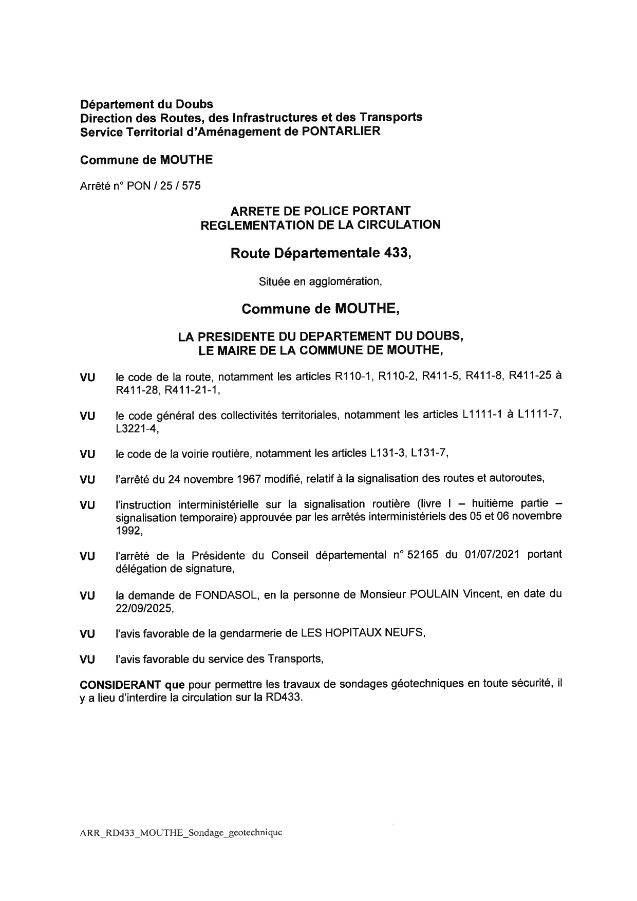 ARRETE 25 / 575 DEP433 - REGLEMENTATION DE LA CIRCULATION