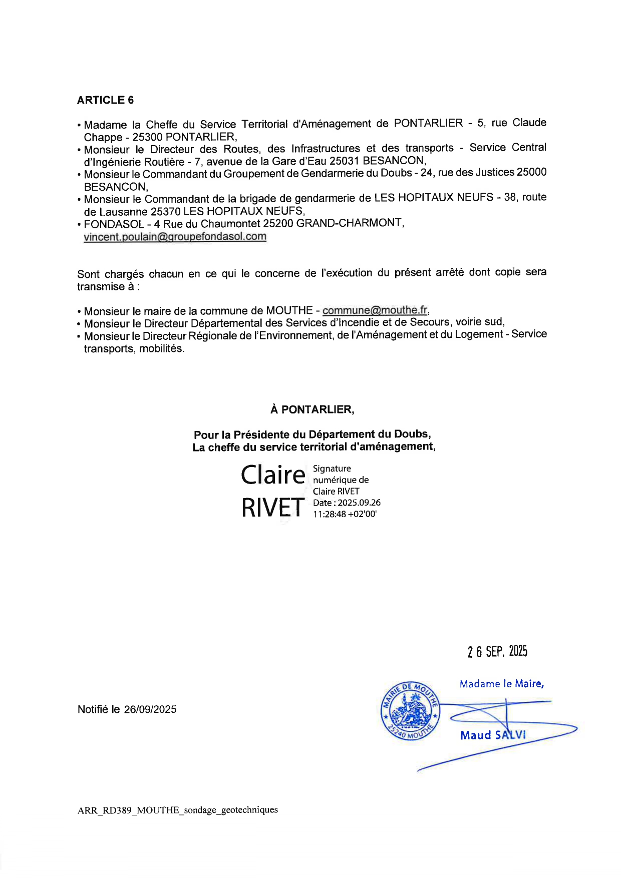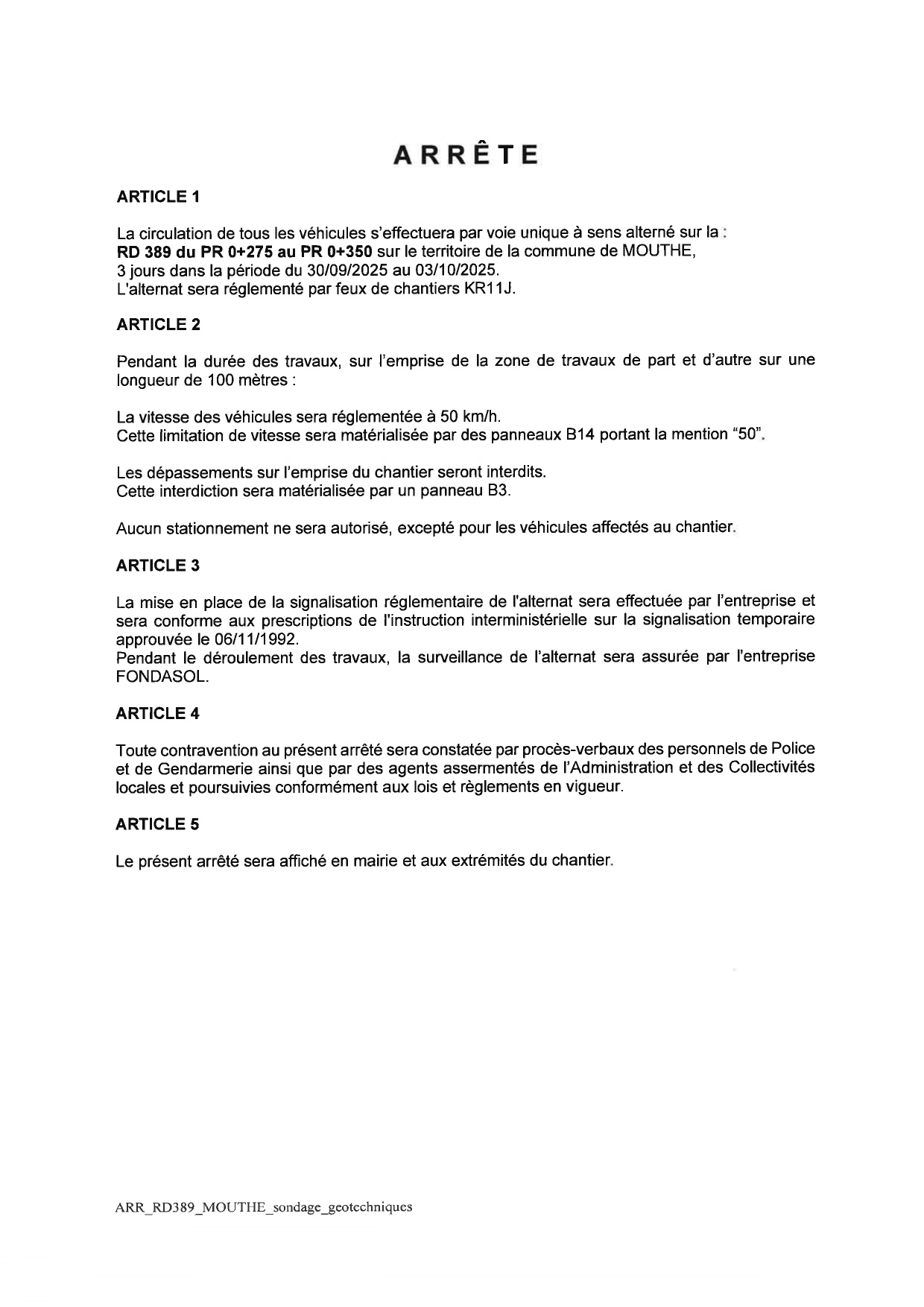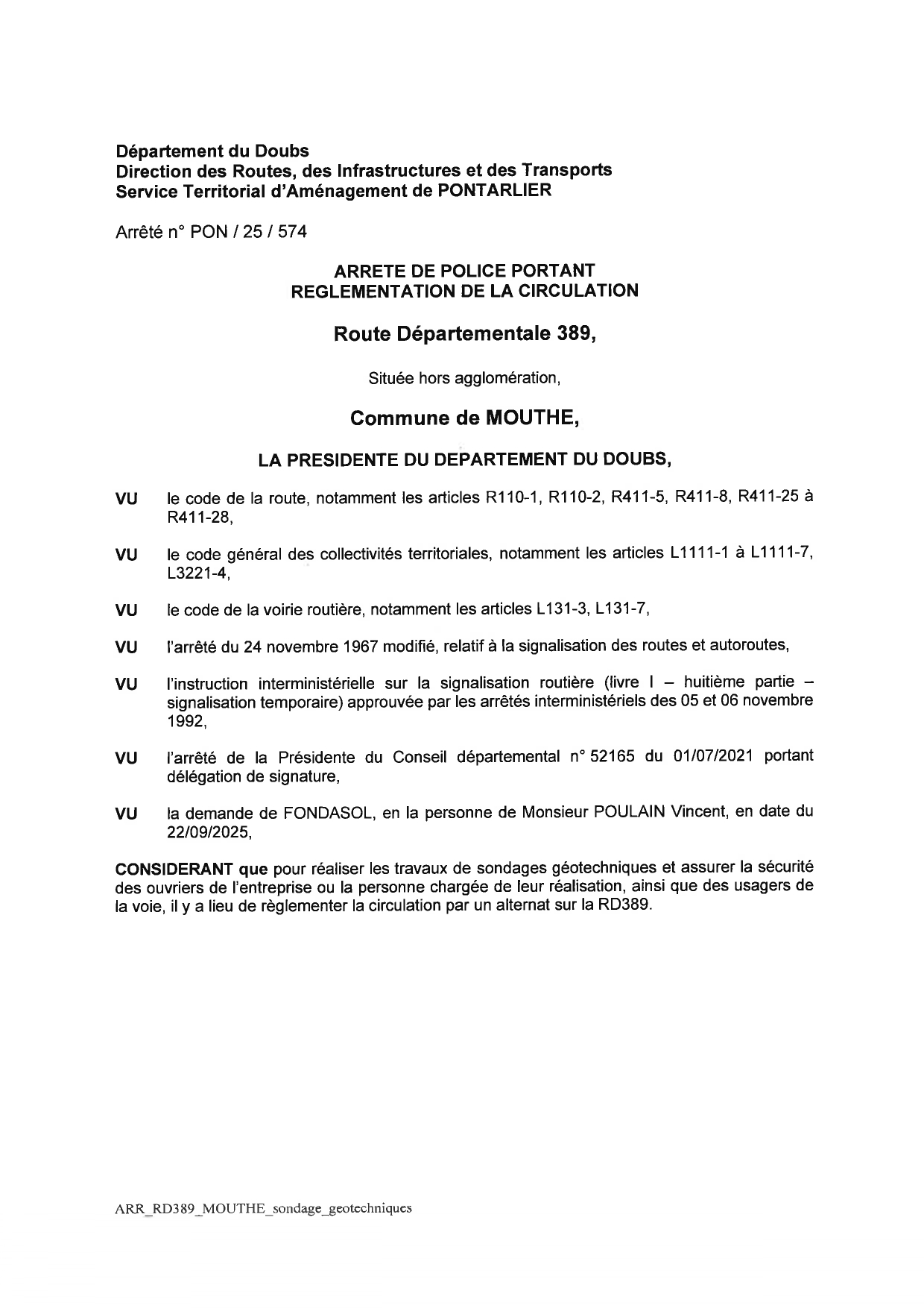 ARRETE PON 25 574 DEP389 - REGLEMENTATION DE LA CIRCULATION