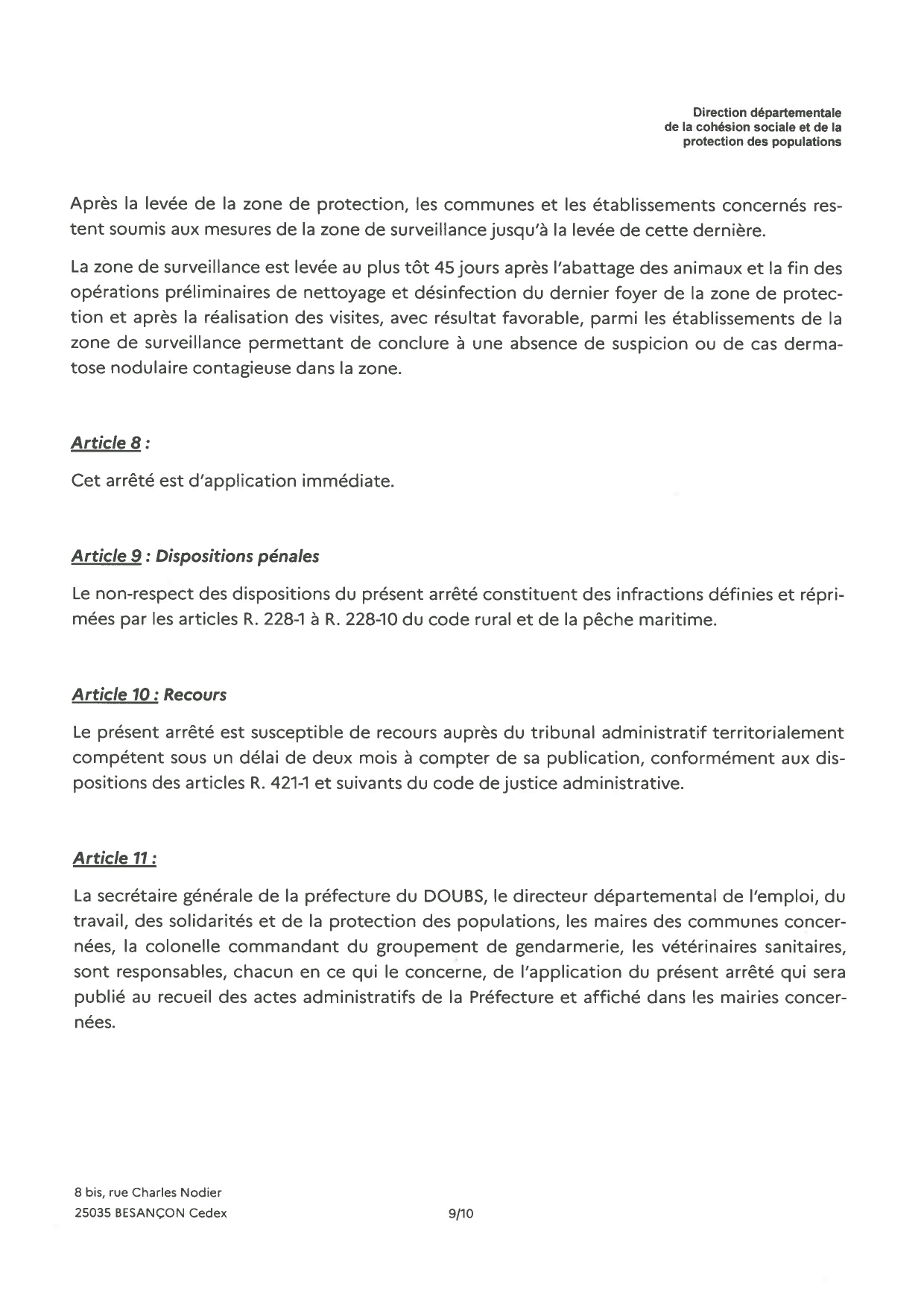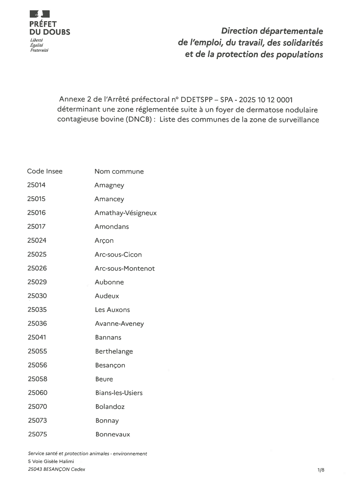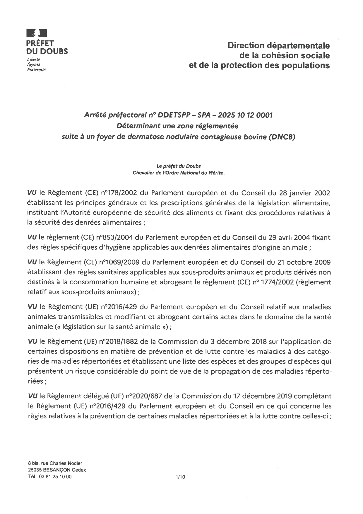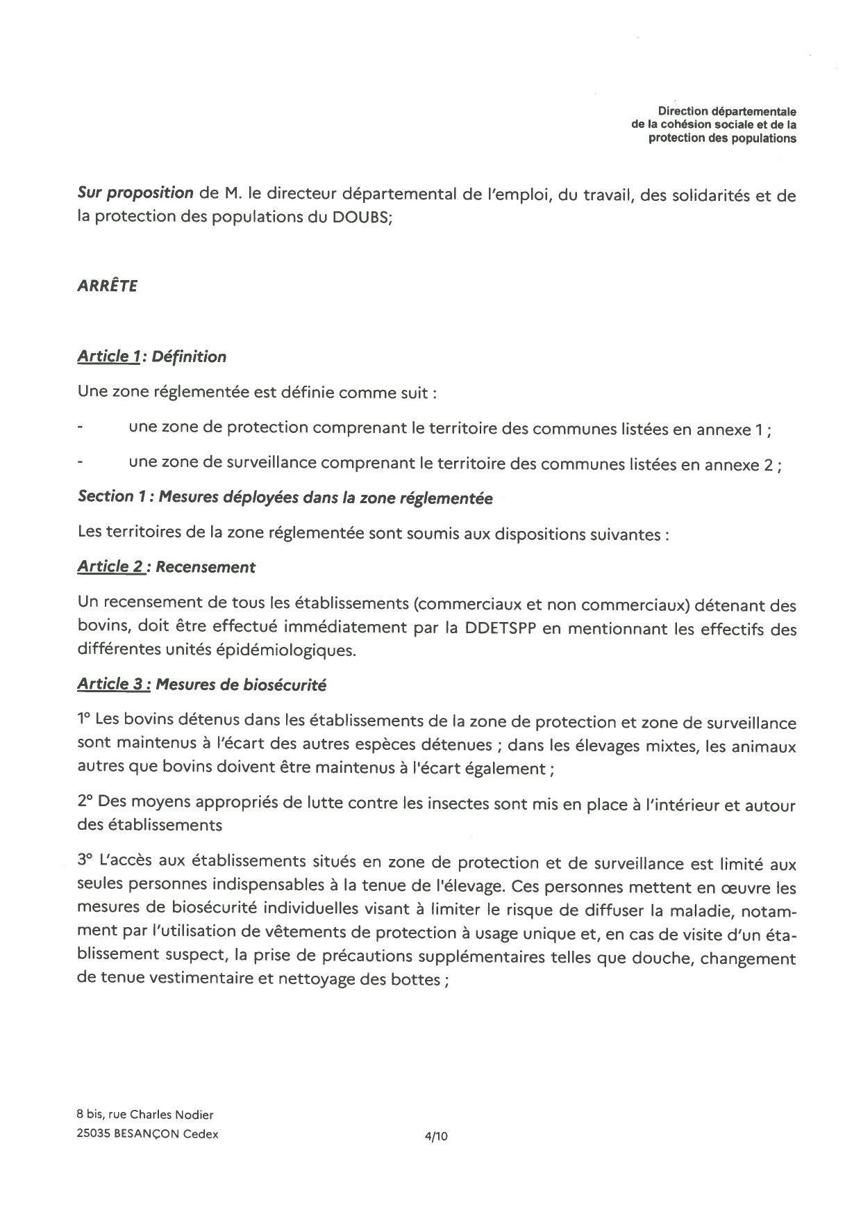 Nous vous prions de bien vouloir trouver ci-joint l'arrêté instituant une zone réglementée dans le département du Doubs.