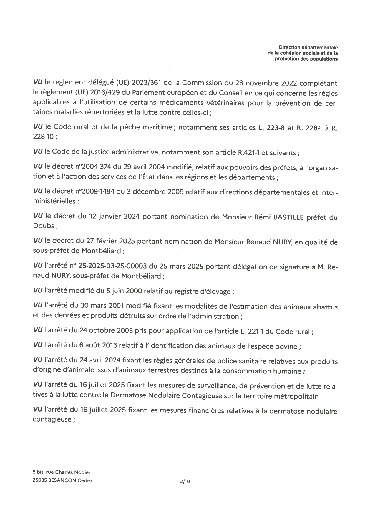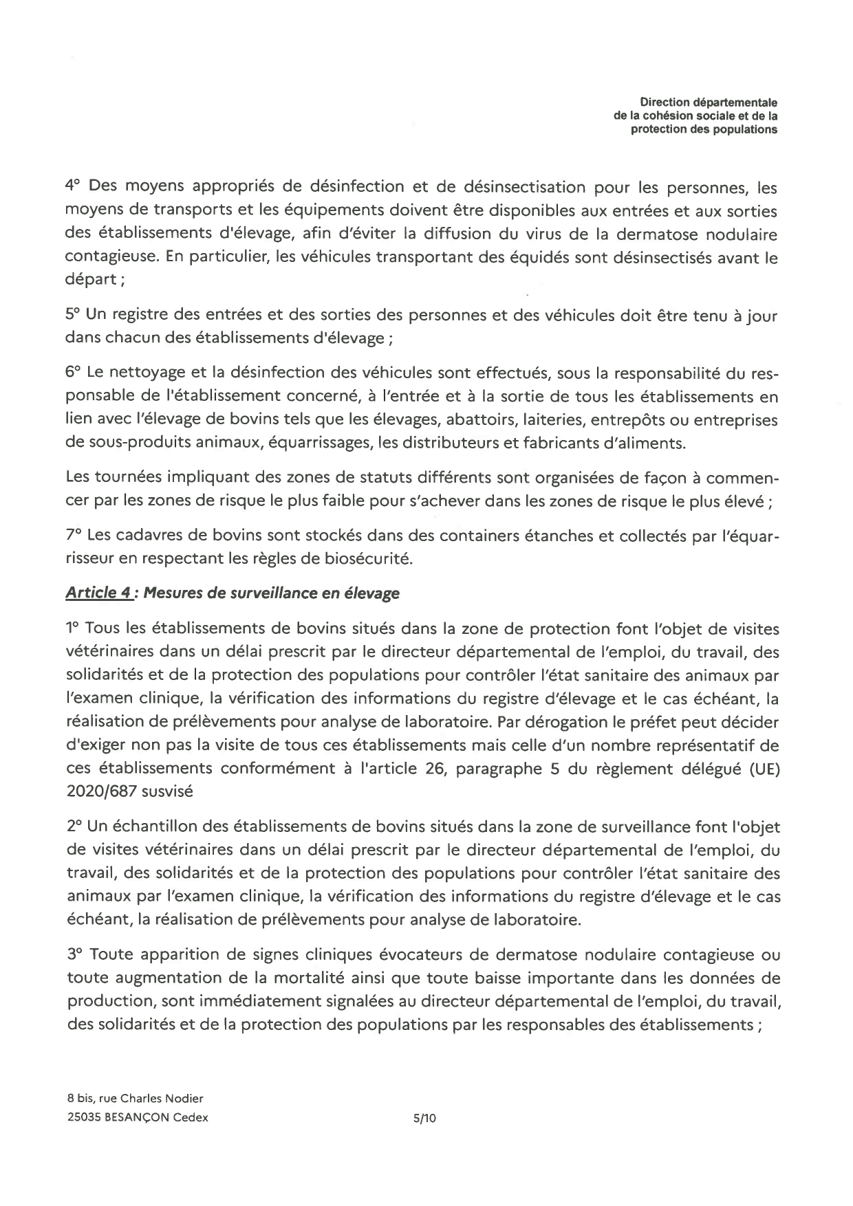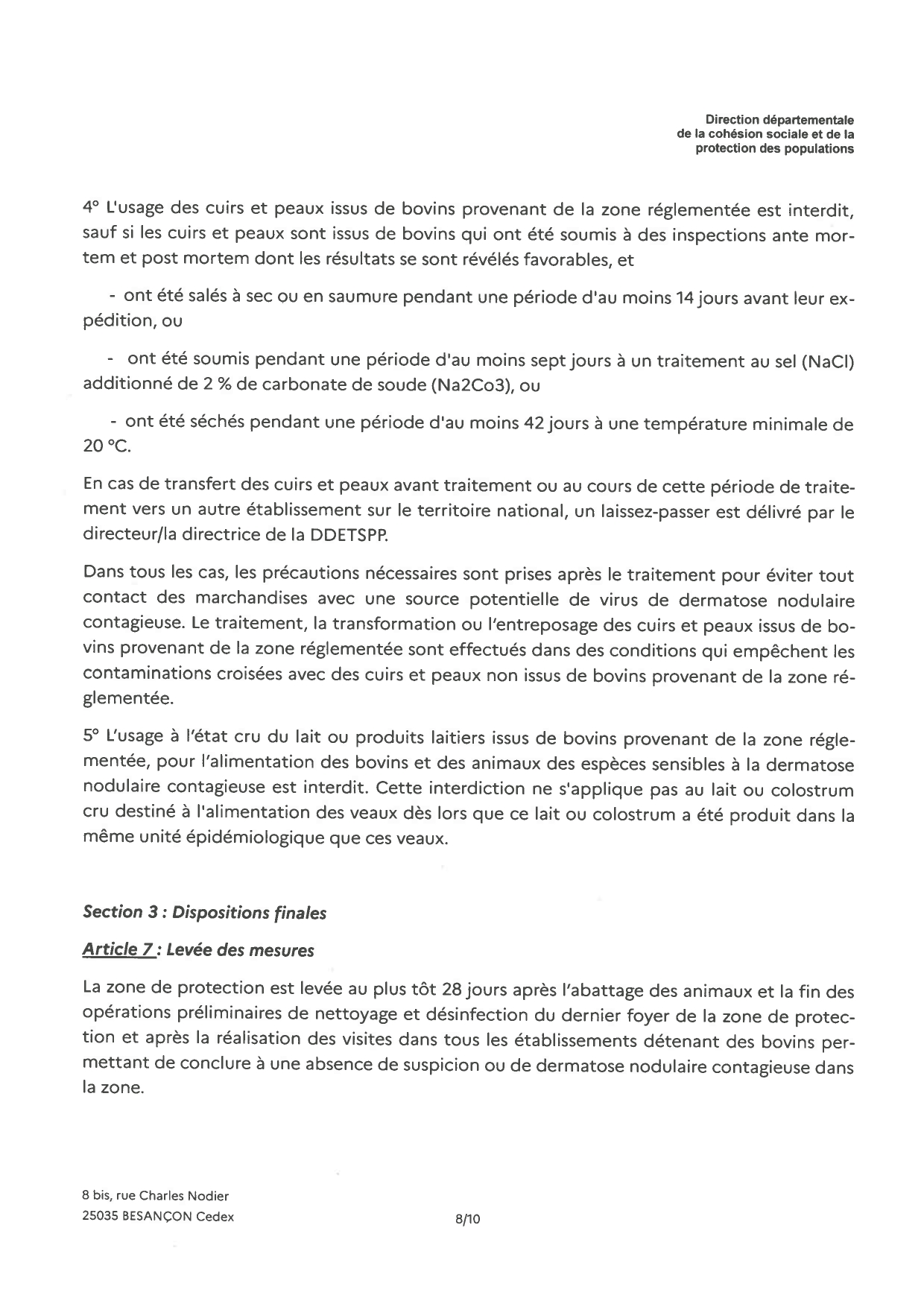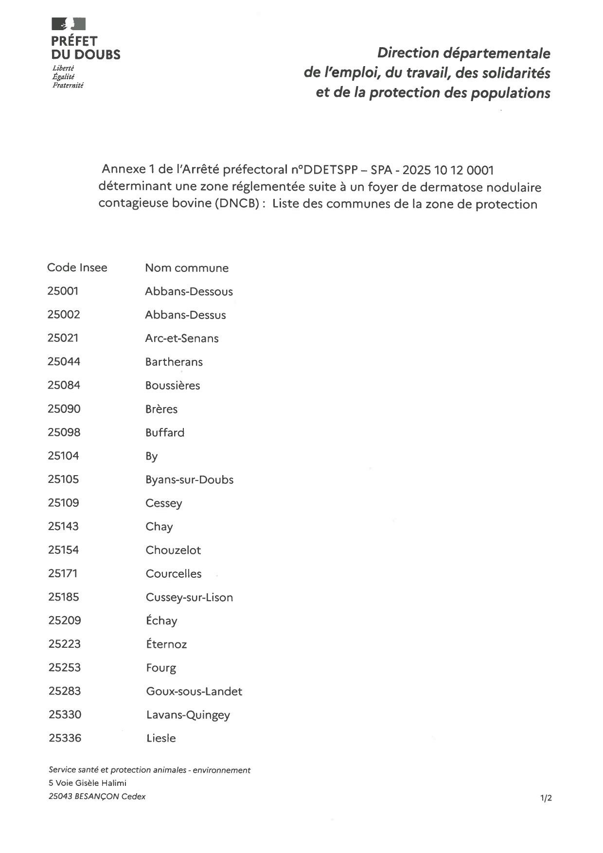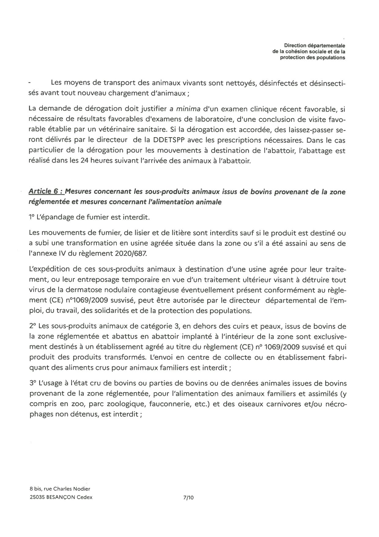 Nous vous prions de bien vouloir trouver ci-joint l'arrêté instituant une zone réglementée dans le département du Doubs.