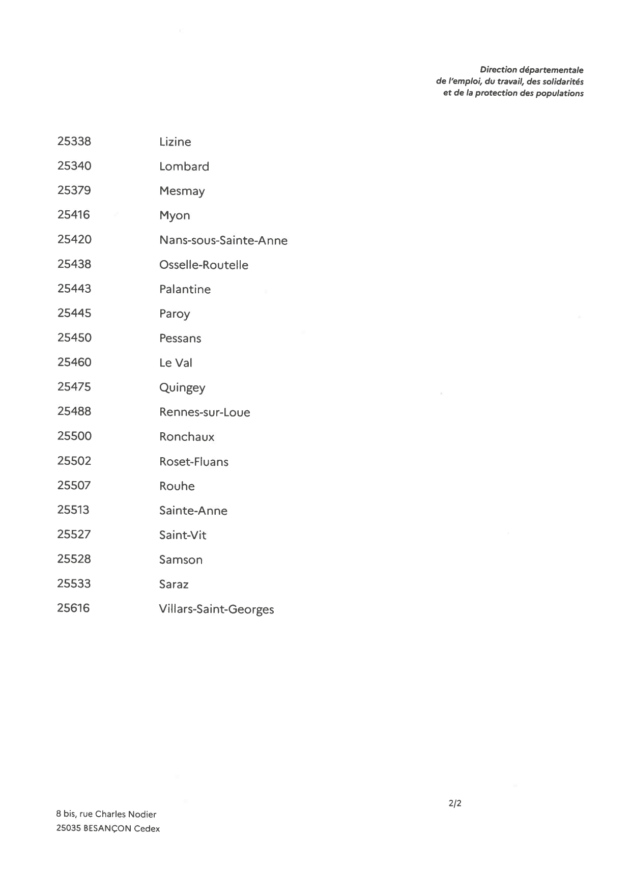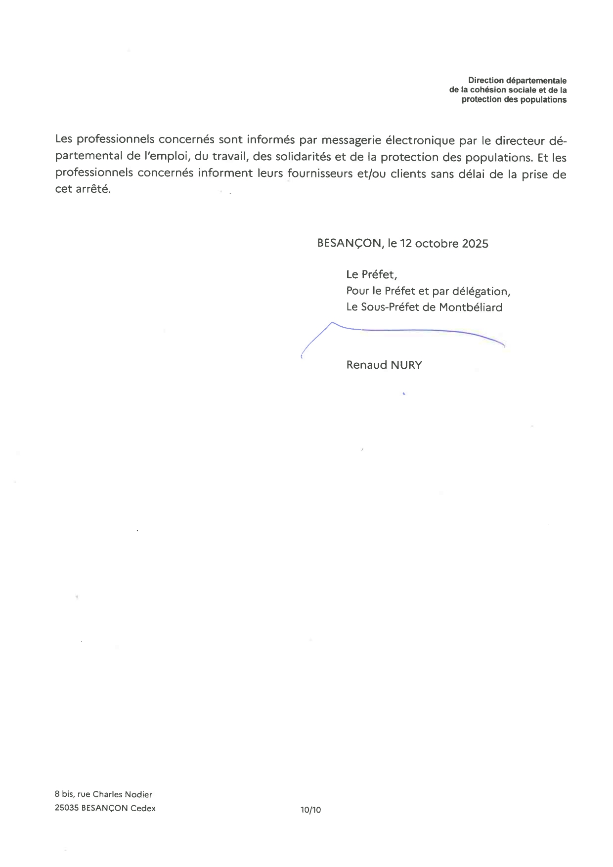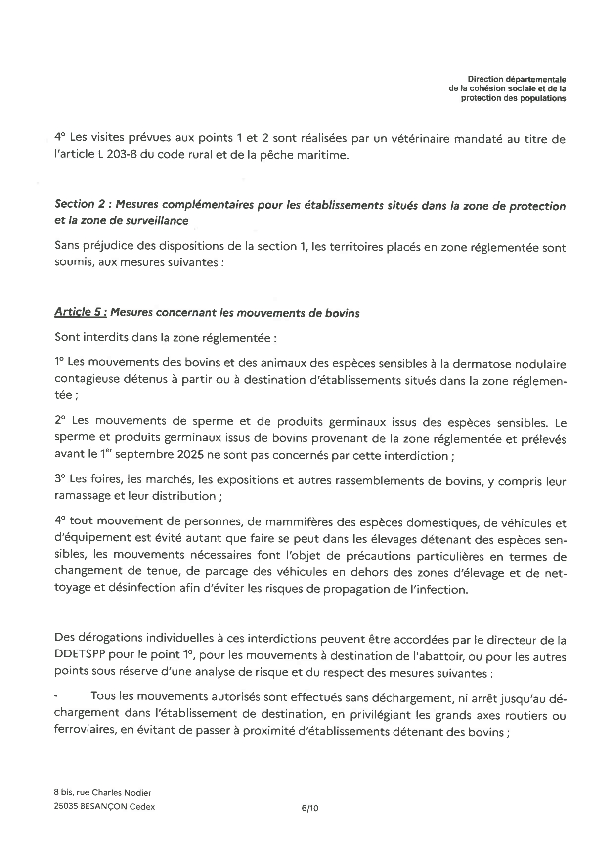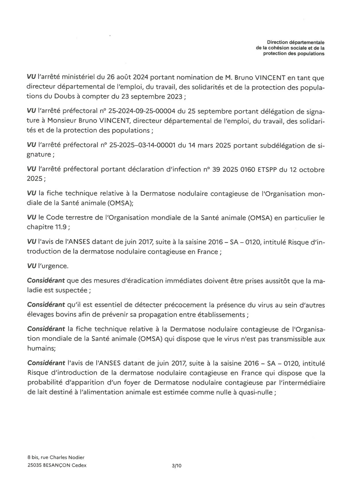 Nous vous prions de bien vouloir trouver ci-joint l'arrêté instituant une zone réglementée dans le département du Doubs.