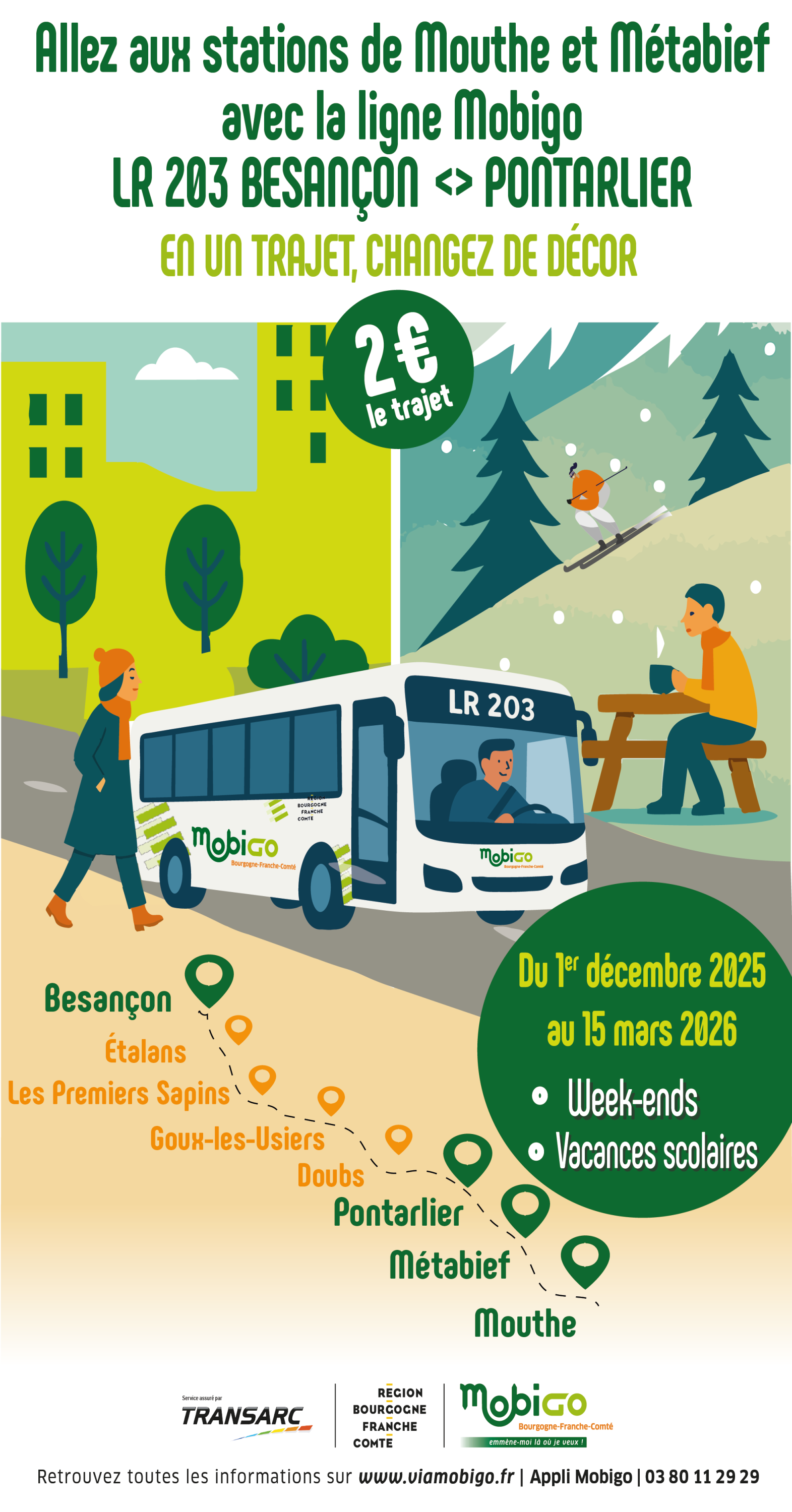 Du 1er décembre 2025 au 15 mars 2026, la ligne Mobigo LR 203 Besançon <> Pontarlier vous emmène à Mouthe et à Métabief 🎿