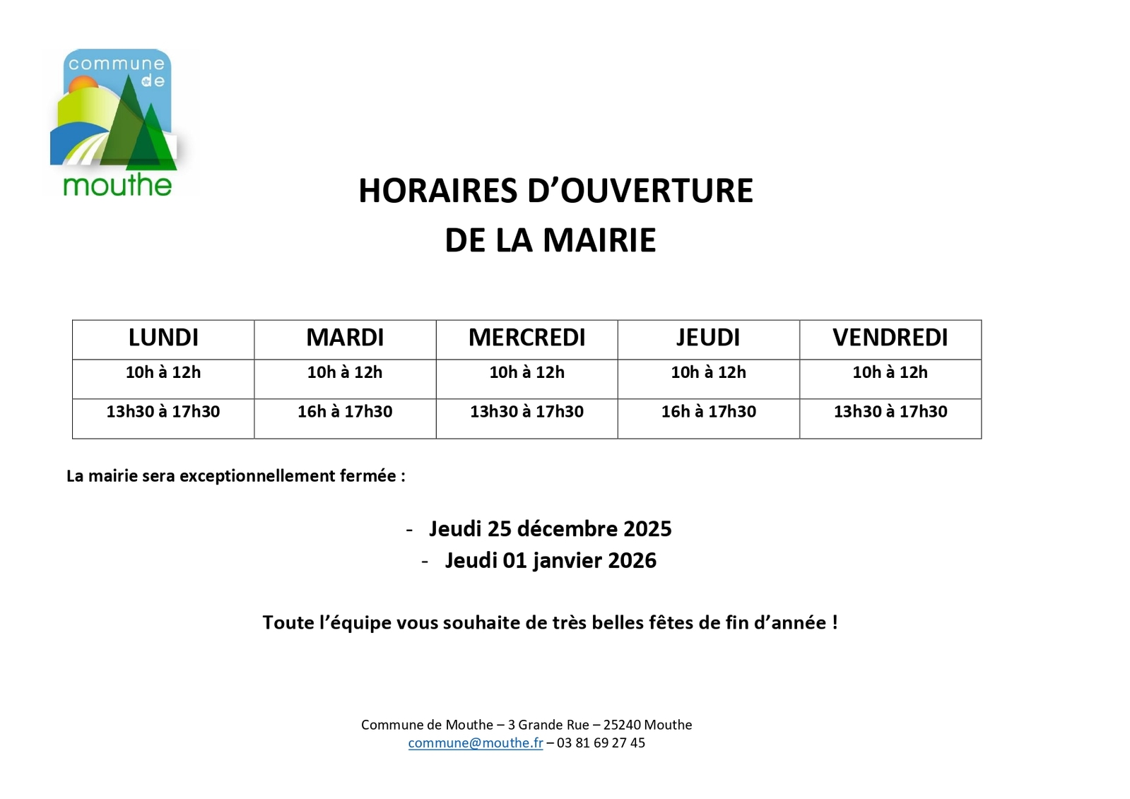 HORAIRES D'OUVERTURE DE LA MAIRIE